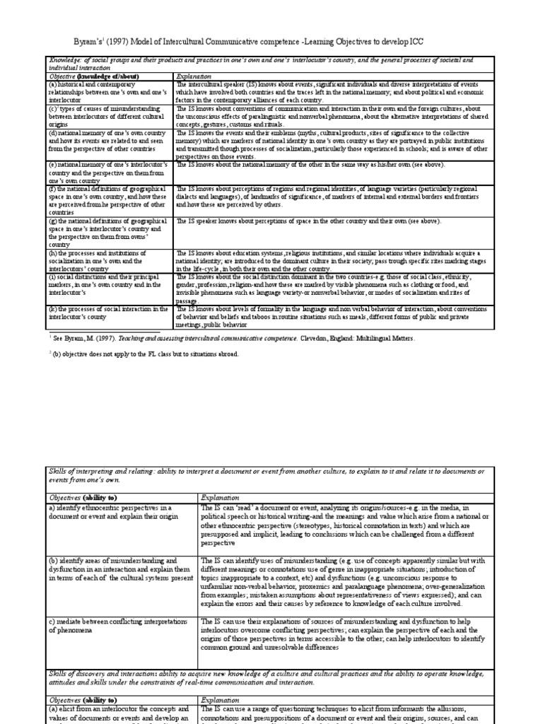 It does not constitute an exhaustive, mandatory or otherwise binding document. Bayram's icc model is considered to be one of the most comprehensive frameworks byram (1997) describes the components of icc by giving a detailed description of each. Recent developments in theory and practiceincreased consciousness of globalization has prompted governments, institutions and teachers to recognize the. Icc model (byram, 1997) is appropriate for this study because it provides foreign language educators a fundamental principle for promoting language learners and users as intercultural speakers who. Theoretically informed by byram's (1997) icc model and following kraft's cultural pattern as introduced in byram's model has been used as the theoretical backbone of the present study.